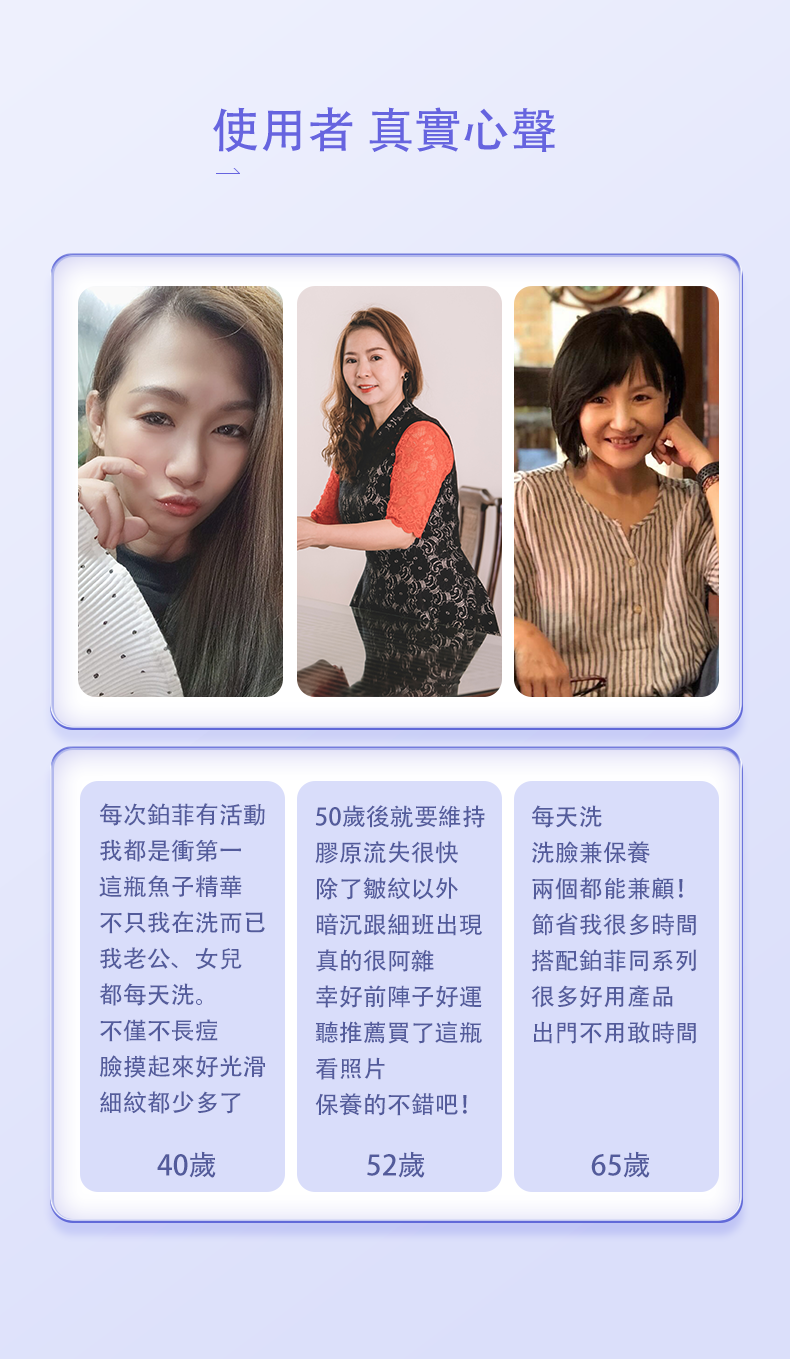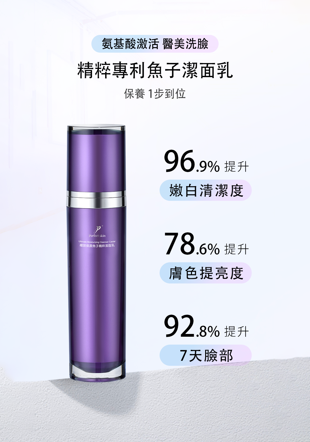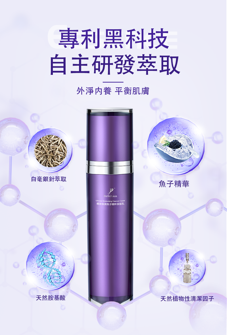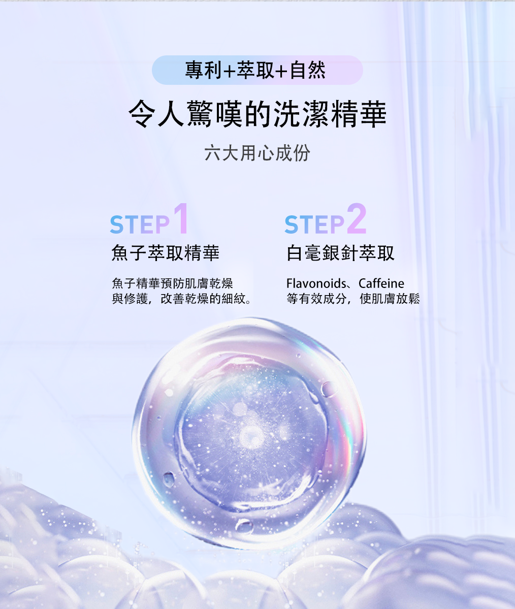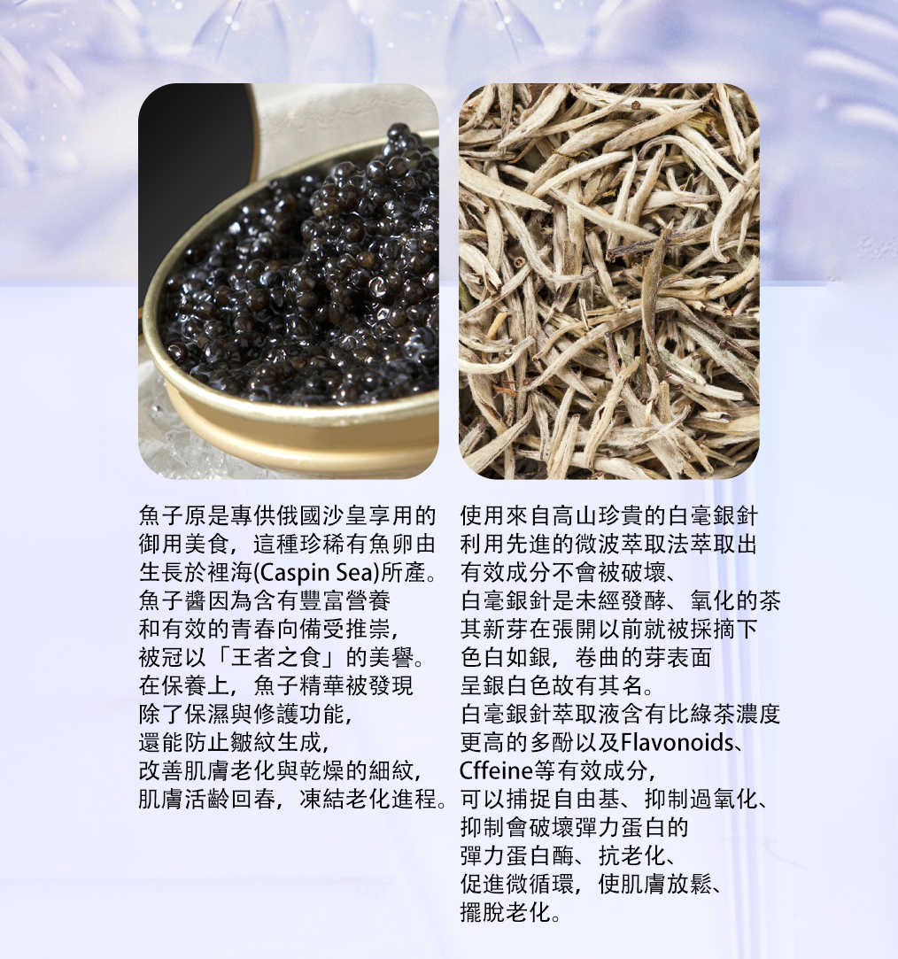 富含魚子精華的頂級享受 寵愛您最珍貴的肌膚 弱酸性、不含皂鹼,柔嫩呵護肌膚,全膚質適用。 在徹底清除肌膚髒污的同時保有肌膚水份 胺基酸的介面活性劑不含皂鹼,洗後不傷肌膚,皮膚細緻不緊繃、清爽細嫩,以最溫和的方式替您做最深層的潔淨。 稀珍的植物萃取 呵護肌膚的最佳聖品 頂級的魚子精華、高山的白毫銀針萃取,以海與陸最珍貴的萃取精華,鎖住您肌膚的歲月。
