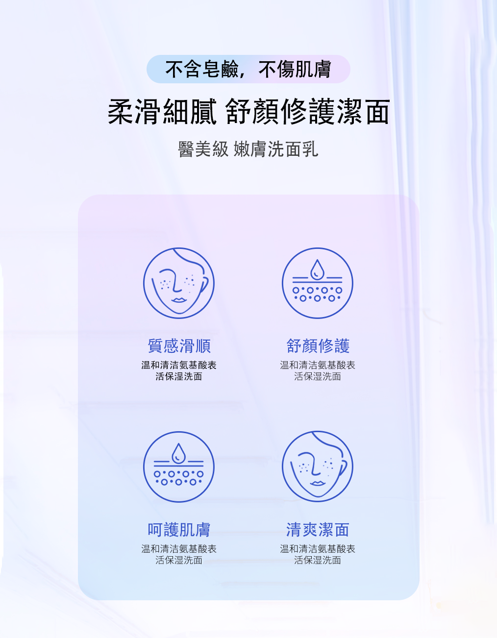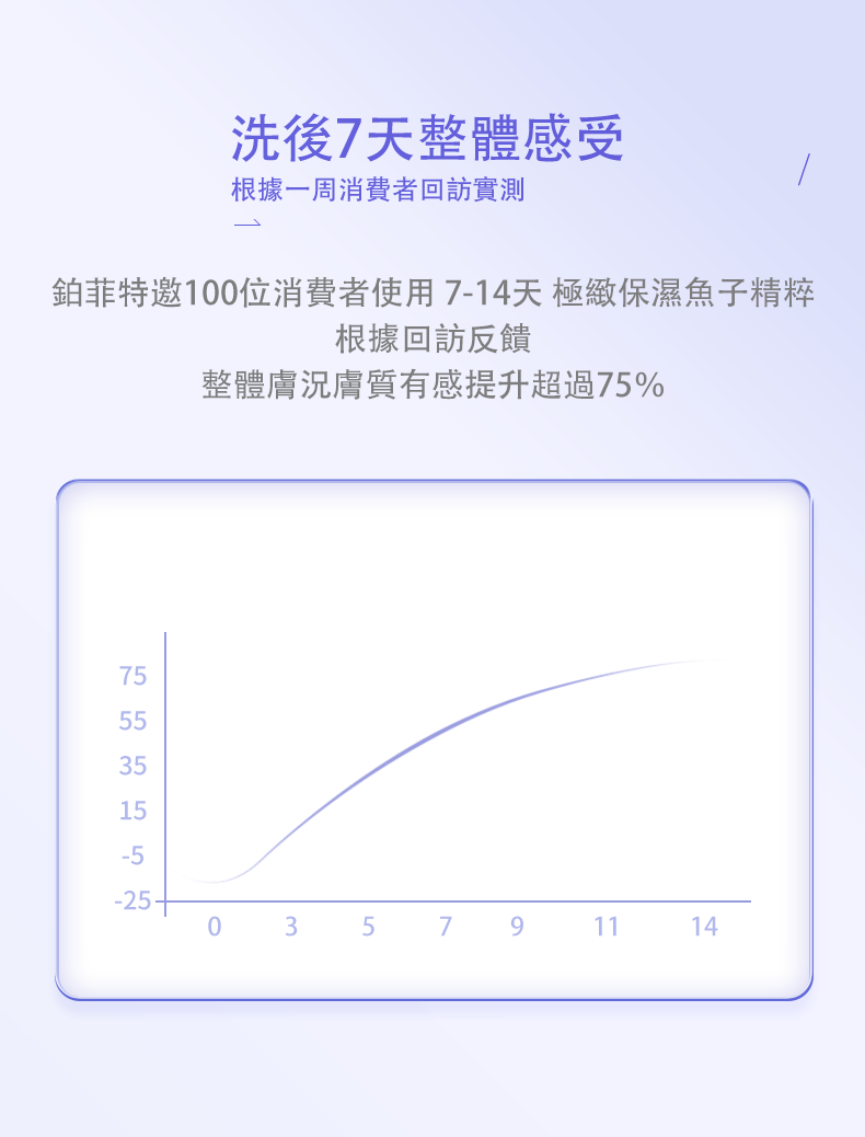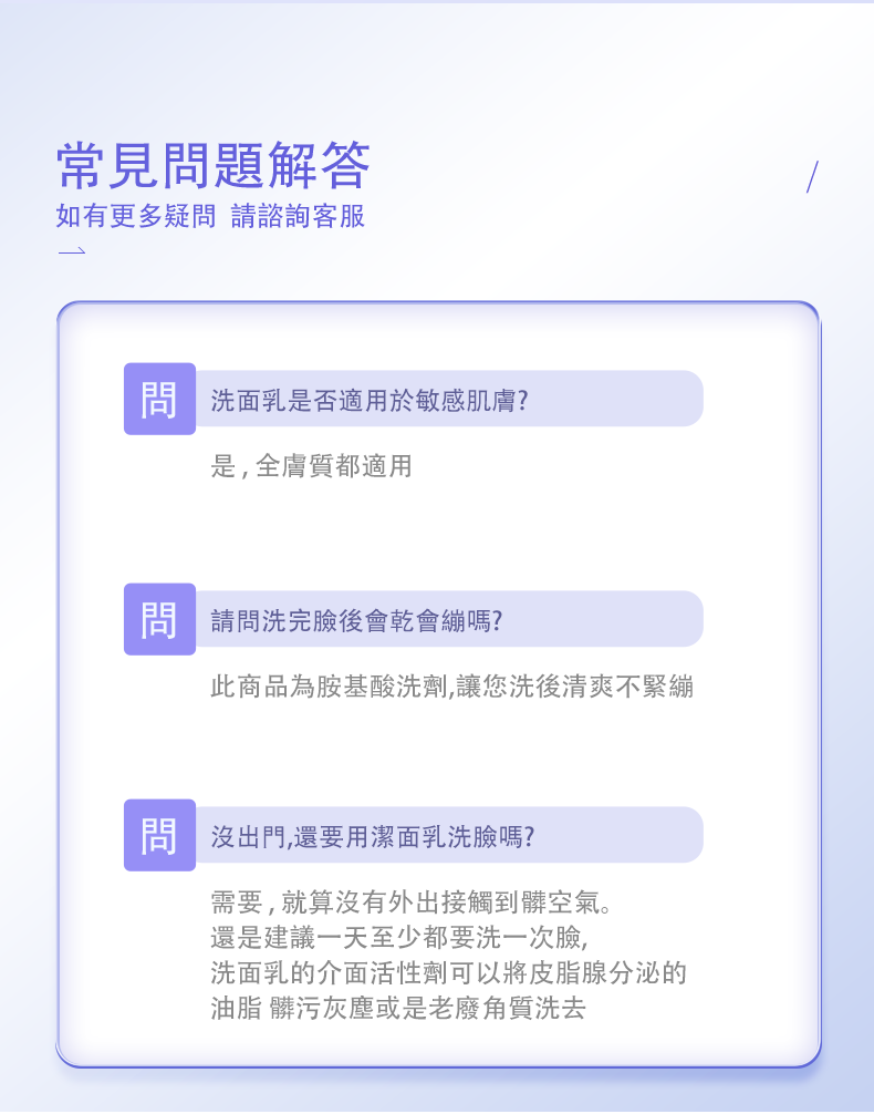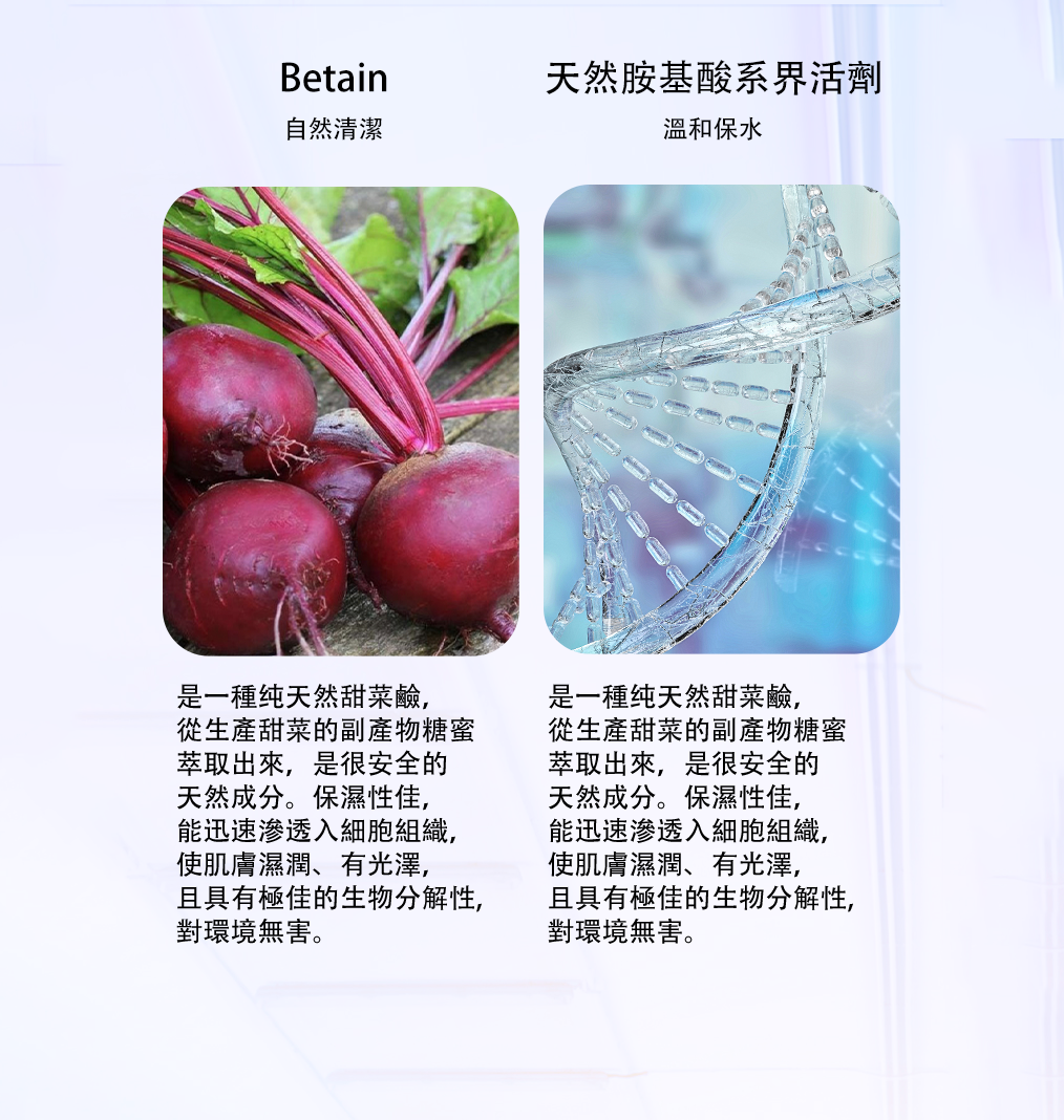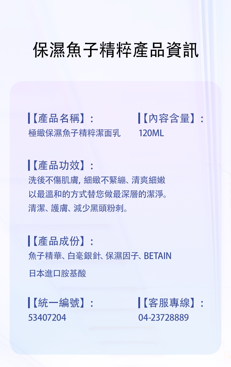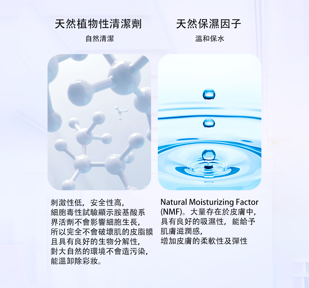 魚子精華 魚子精華不僅可以預防肌膚乾燥與修護,改善肌膚乾燥的細紋,讓肌膚潤澤細嫩。 白毫銀針 含有比綠茶濃度更高的多酚以及Flavonoids、Caffeine等有效成分,捕捉自由基,使肌膚放鬆。 保濕因子 保濕因子Natural Moisturizing Factor(NMF)大量存在於皮膚中,具有良好的吸濕性,能給予肌膚飽水感,增加皮膚的柔軟性及彈性。 Betain 是一種植物甜菜鹼萃取,其肌膚飽水度佳,能迅速滲透皮膚,使肌膚濕潤、有光澤。 日本進口胺基酸 弱酸性且親膚性高,不傷害皮脂膜,溫和洗淨臉上多餘油脂及髒汙,洗後清爽不緊繃。