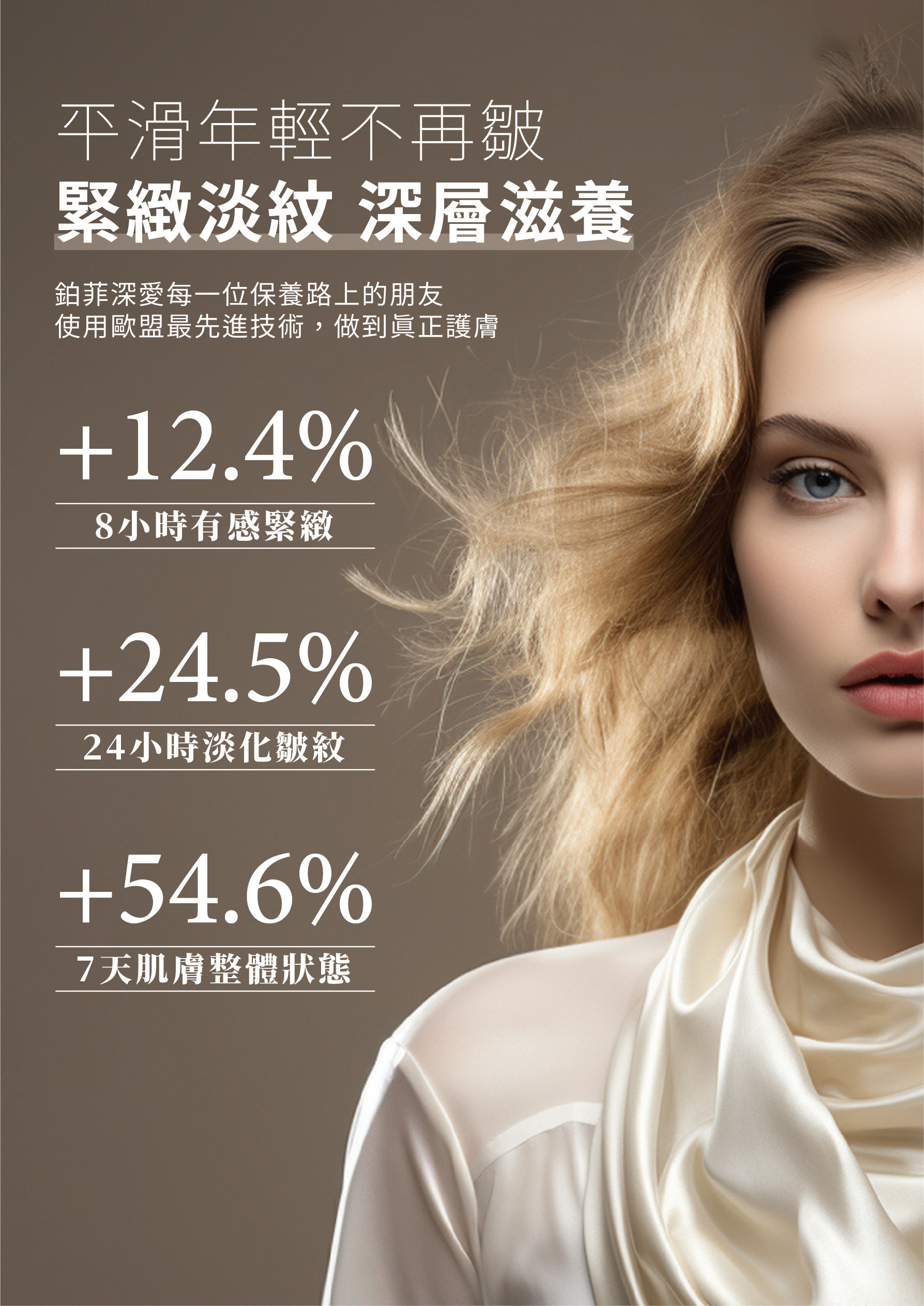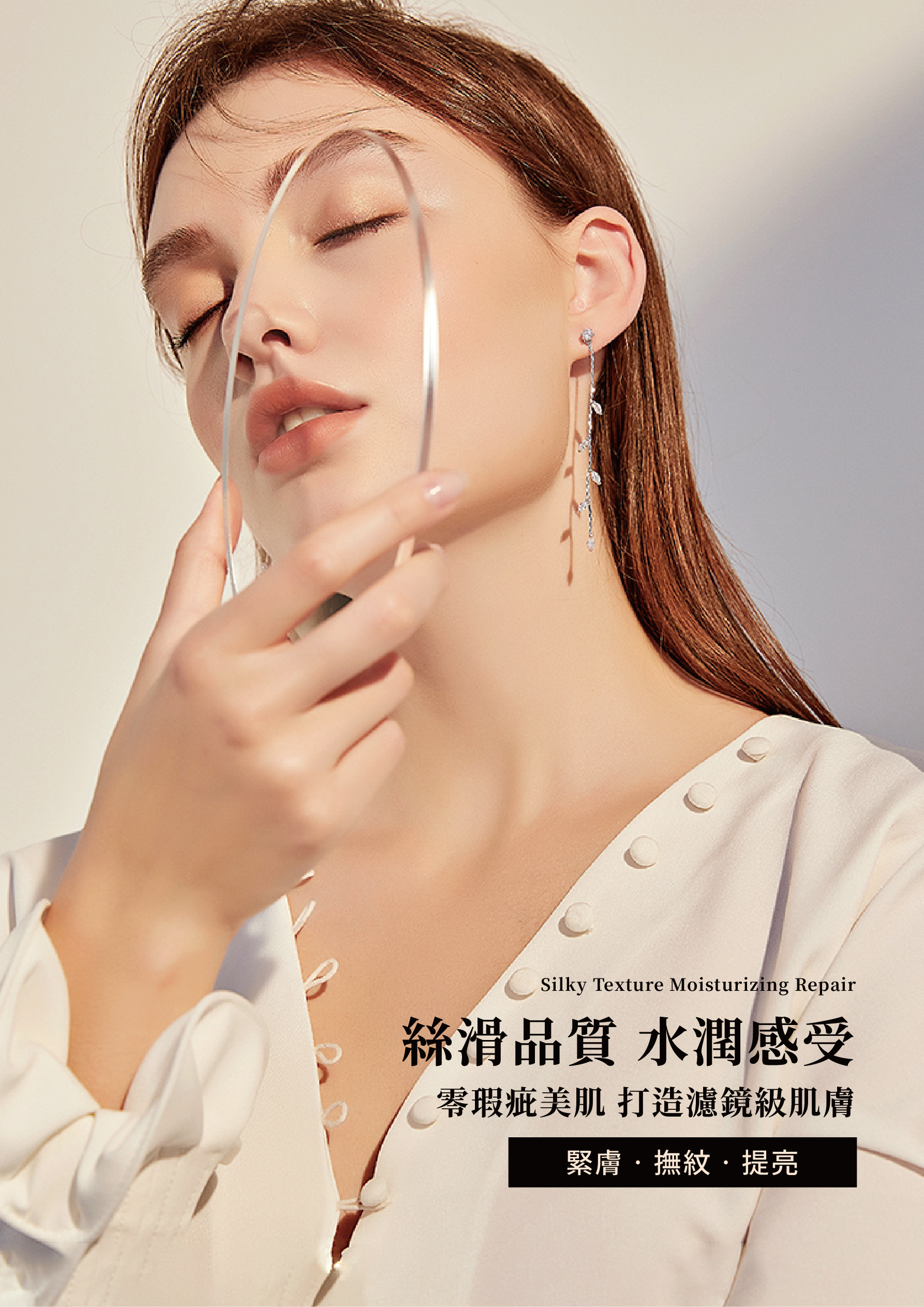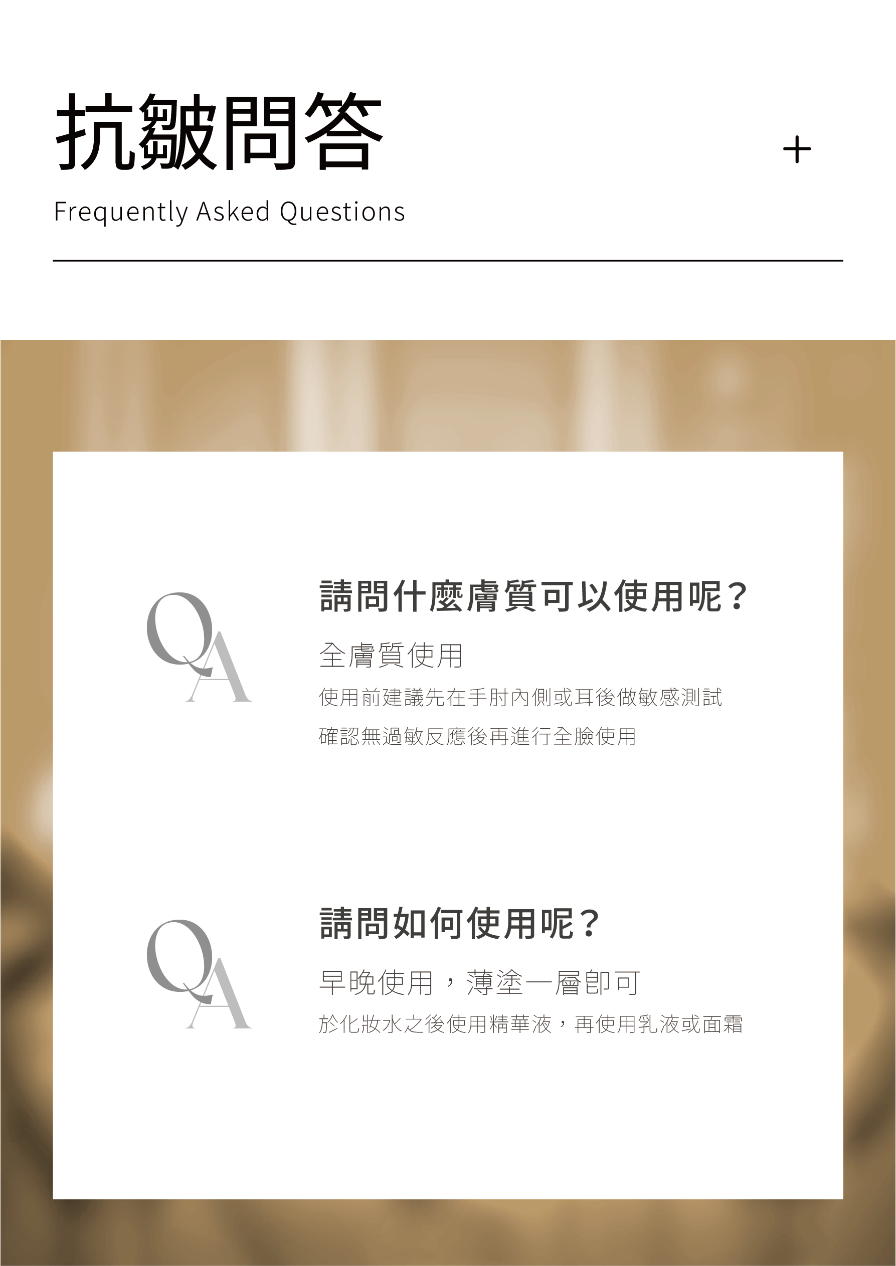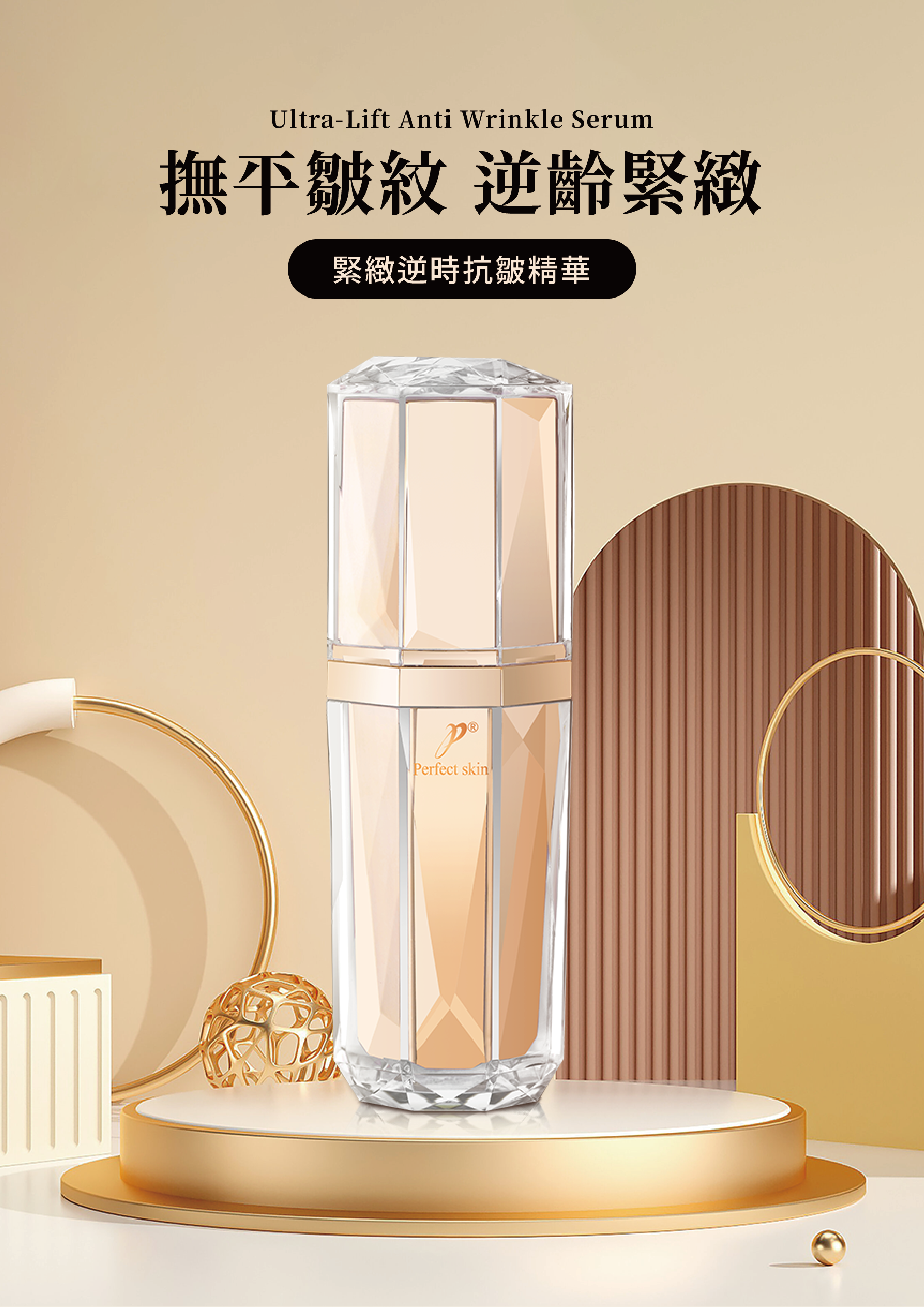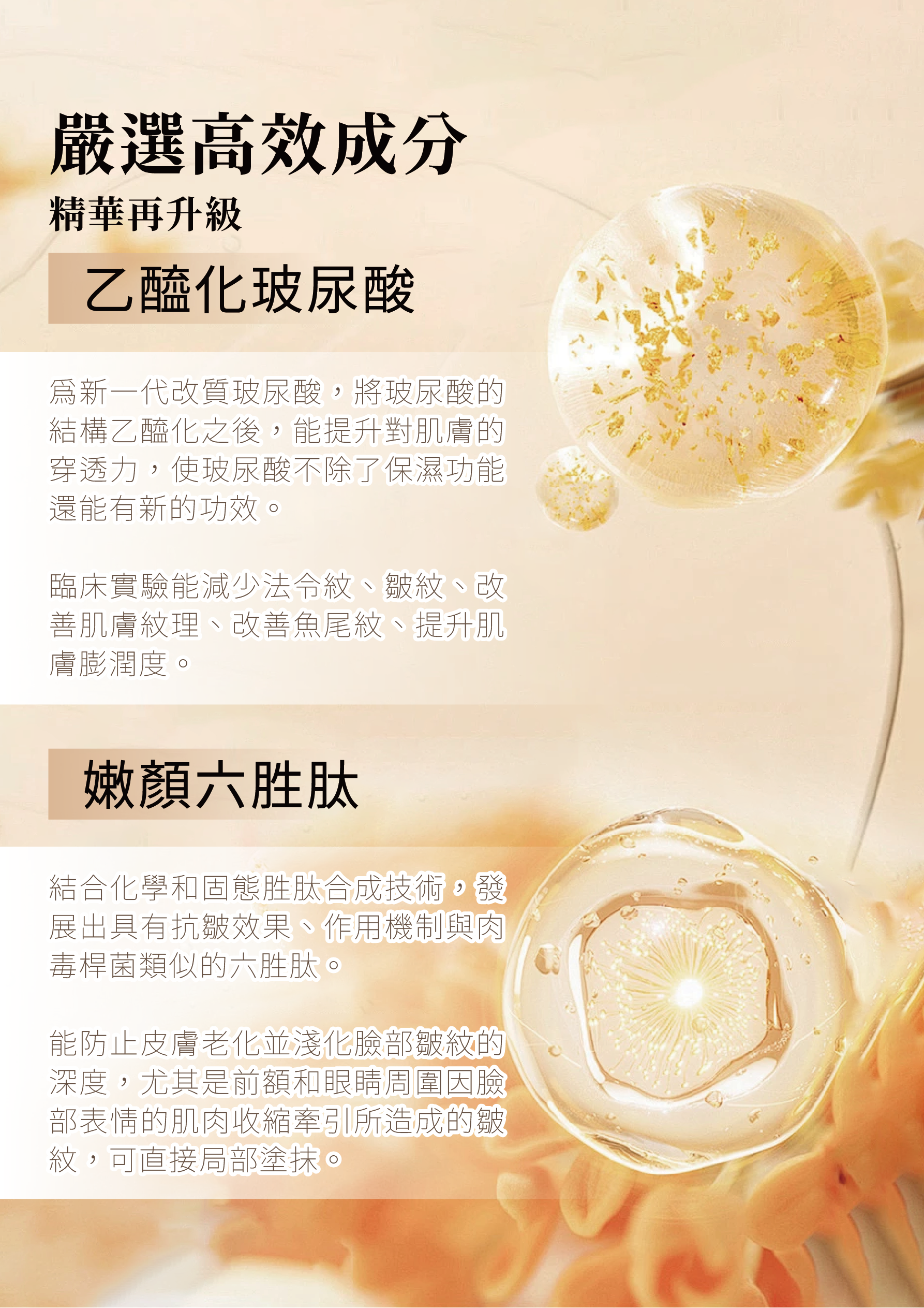 緊緻抗皺精華以六胜肽、三元胜肽複合精華、擬球藻萃取、水解精米蛋白等各種淡化皺紋、緊實肌膚成分結合具有強力保濕功效的乙醯化玻尿酸,由內而外、持續深層調理肌膚,讓因老化與外界刺激傷害而衰老的肌膚回復年輕緊緻,迅速撫平肌膚皺紋、淡化紋路,維持肌膚彈性,肌膚年輕緊緻光采。