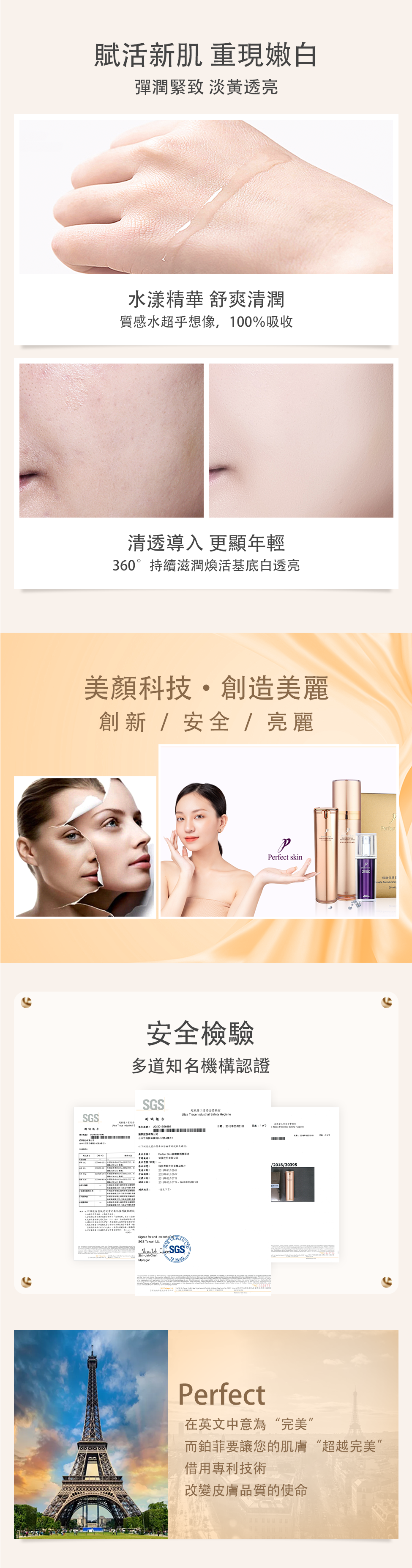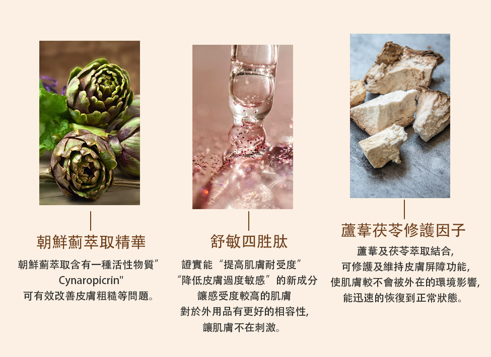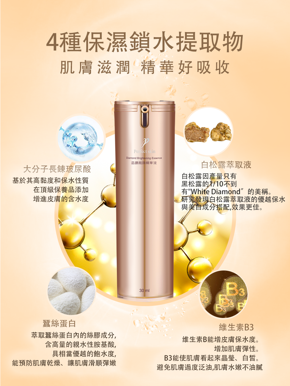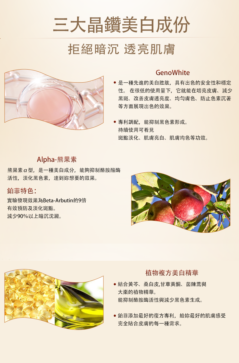 GenoWhite 具專利之美白胜肽,能抑制黑色素形成。 持續使用可看見斑點淡化、肌膚亮白、肌膚均色等功效。 Alpha-熊果素 實驗發現效果為Beta-Arbutin的9倍,能有效預防及淡化斑點,減少黑色素沈澱。 維生素B3 維生素B能增皮膚保水度,增加肌膚彈性。 此外,維生素B3能使肌膚看起來晶瑩、白皙,且能避免肌膚過度泛油,使肌膚水嫩不油膩。 白松露萃取液 白松露因產量只有黑松露的1/10不到而更形珍貴,素有”White Diamond”的美稱。 經研究發現白松露萃取液含大量的胺基酸成分,且具有優越的護膚、保水效果,使肌膚恢復健康並維持平衡狀態。與美白成分搭配,效果更佳。 朝鮮薊萃取精華 朝鮮薊萃取含有一種活性物質”Cynaropicrin”,可有效改善皮膚粗糙等問題。 植物複方美白精華 結合黃芩、桑白皮、甘草黃酮、茵陳蒿與大棗的植物精華,能抑制酪胺酶活性與減少黑色素生成。 紓敏四胜肽 紓敏四胜肽經證實能提高肌膚耐受度、降低皮膚過度反應的新科技成分,讓感受度較高的肌膚對於外界環境與外用品有更好的相容性,大大降低肌膚不適與刺激。 蘆葦茯苓複合修護因子 蘆葦及茯苓萃取結合,可修護及維持皮膚屏障功能,使肌膚較不會被外在的環境影響,能迅速的恢復到正常狀態。 大分子長鏈玻尿酸 其具有較強的保水作用,在化妝品護膚方面的應用正是基於其高黏度和保水性質,以增進皮膚的含水度。 蠶絲蛋白(絲膠蛋白) 萃取自蠶絲蛋白內的絲膠成分,含高量的親水性胺基酸,具相當優越的飽水度,能保預防肌膚乾燥補水、能肌膚滑順、有彈性。