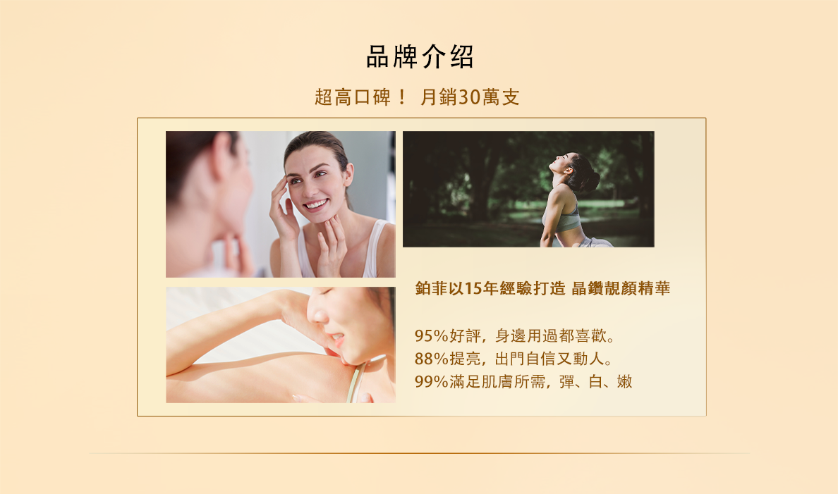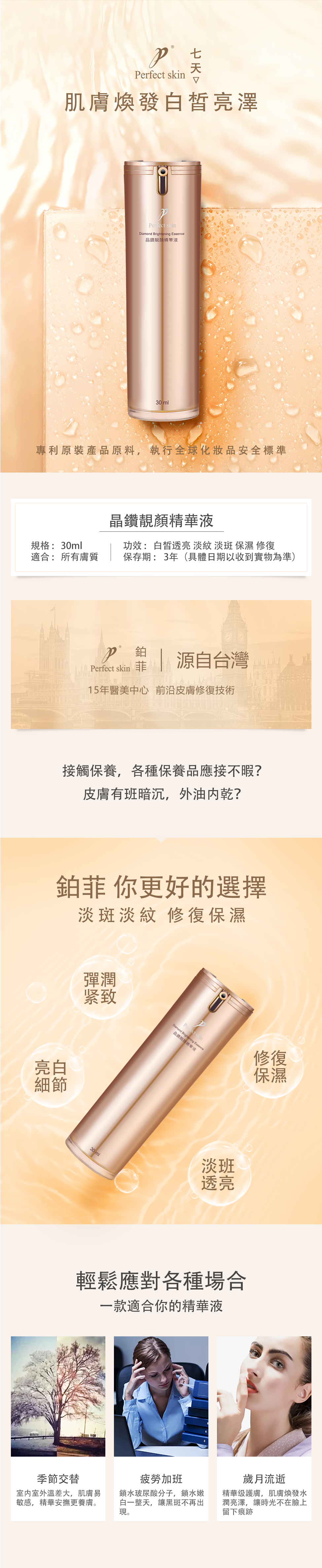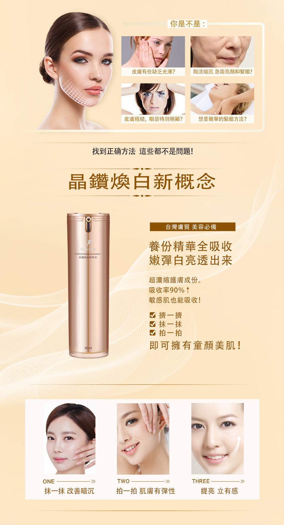 GenoWhite 具專利之美白胜肽,能抑制黑色素形成。 持續使用可看見斑點淡化、肌膚亮白、肌膚均色等功效。 Alpha-熊果素 實驗發現效果為Beta-Arbutin的9倍,能有效預防及淡化斑點,減少黑色素沈澱。 維生素B3 維生素B能增皮膚保水度,增加肌膚彈性。 此外,維生素B3能使肌膚看起來晶瑩、白皙,且能避免肌膚過度泛油,使肌膚水嫩不油膩。 白松露萃取液 白松露因產量只有黑松露的1/10不到而更形珍貴,素有”White Diamond”的美稱。 經研究發現白松露萃取液含大量的胺基酸成分,且具有優越的護膚、保水效果,使肌膚恢復健康並維持平衡狀態。與美白成分搭配,效果更佳。 朝鮮薊萃取精華 朝鮮薊萃取含有一種活性物質”Cynaropicrin”,可有效改善皮膚粗糙等問題。 植物複方美白精華 結合黃芩、桑白皮、甘草黃酮、茵陳蒿與大棗的植物精華,能抑制酪胺酶活性與減少黑色素生成。 紓敏四胜肽 紓敏四胜肽經證實能提高肌膚耐受度、降低皮膚過度反應的新科技成分,讓感受度較高的肌膚對於外界環境與外用品有更好的相容性,大大降低肌膚不適與刺激。 蘆葦茯苓複合修護因子 蘆葦及茯苓萃取結合,可修護及維持皮膚屏障功能,使肌膚較不會被外在的環境影響,能迅速的恢復到正常狀態。 大分子長鏈玻尿酸 其具有較強的保水作用,在化妝品護膚方面的應用正是基於其高黏度和保水性質,以增進皮膚的含水度。 蠶絲蛋白(絲膠蛋白) 萃取自蠶絲蛋白內的絲膠成分,含高量的親水性胺基酸,具相當優越的飽水度,能保預防肌膚乾燥補水、能肌膚滑順、有彈性。